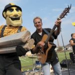 Pittsburgh Steelers mascot Steely McBeam plays air guitar with members of Saddle Up on Friday, Aug. 3, 2012 before the scrimmage at Latrobe Memorial Stadium.