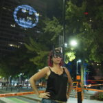 A woman poses for a photo beneath a Batman signal projected onto a building to celebrate Batman Day in Montreal, Saturday, Sept. 21, 2019.