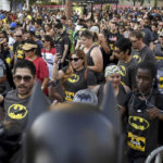 A man in a Batman cape takes photos with his cellphone during the lighting of the Bat signal commemorating Batman’s 80th anniversary in Mexico City, Saturday, Sept. 21, 2019.