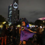 Stephanie Salgado poses with her cape during the lighting of the Bat signal commemorating Batman’s 80th anniversary in Mexico City, Saturday, Sept. 21, 2019.