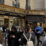 People walk past the “Modern bakery”, Place de d’Estrapade, in Paris, Wednesday, April 19, 2023.