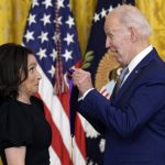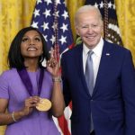 President Joe Biden presents the 2021 National Medal of the Arts to Mindy Kaling at White House in Washington, Tuesday, March 21.