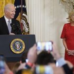 President Joe Biden, accompanied by first lady Jill Biden, speaks during a Nowruz celebration in the East Room of the White House, Monday, March 20.