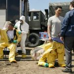 Agent Matthew Ryker (Daniel Dae Kim) talks with Agent Moore (Ian Colletti) as he removes his HAZMAT suit after exiting the Pentagon in “The Hot Zone: Anthrax.”