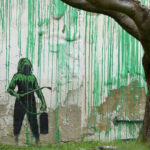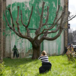 The artwork in the Finsbury Park neighborhood covers the wall of a four-story building and shows a small figure holding a pressure hose beside a large cherry tree. Green paint has been sprayed across the wall, replicating the absent leaves of the tree, which has been severely cropped.