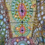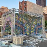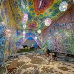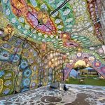 An installation artist, Shapiro used water-based paints to create images on vinyl in a psychedelic pattern which were draped over a metal truss. Handmade light fixtures dangle from inside, illuminating the large structure at night.
