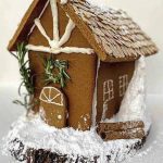 She used a slab of round wood for the foundation. She incorporated rosemary she bought at the grocery store for the greenery and royal icing to decorate the front of the house and adhere each piece of sliced almond she used for the roof’s shingles which took several hours. Two pirouette wafers double as logs on the side of the cabin.