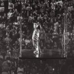 With the bass throbbing on “Bad Guy,” Eilish grabbed a handheld video camera, allowing for some first-person visuals. For “The Greatest,” Eilish returned to the platform, belting it out while laying flat with her head and hair hanging down over the edge. On “Male Fantasy” and “Skinny,” Eilish took the center stage along with backup singers Ava and Jane Horner.