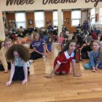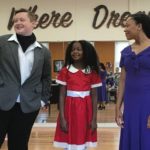 From left, Stage Right’s Arts in Education students Alex Hubble of Mt. Pleasant (Daddy Warbucks), Gracelyn Walker of West Mifflin (Annie) and Hannah Walker of West Mifflin (Grace) rehearse the musical “Annie.”
