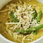 When the soup is hot throughout (don’t let it come to a boil!), serve in bowls garnished with Parmesan and the blanched asparagus tips. Top with a bit of additional freshly ground pepper, if desired.