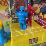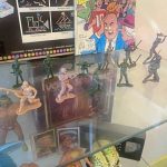 Barnz saved many of his childhood toys and customers have contributed some as well. Some things are encased in glass. There is a Mr. Potato Head, Rock’Em Sock’Em robots, Jarts, Slinky, vinyl records and a even a disco ball. A tricycle and scooter sits in the front corner and a few pair of roller skates are behind the counter.
