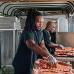 Yassir Elshwafa (left) and Boo Harris prepare ribs for Cowboys BBQ & Rib Co. on Tuesday near Acrisure Stadium on the North Shore for the annual Kickoff and Rib Festival, which runs Wednesday through Monday.