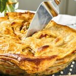 Place the puff pastry over the filling, and trim off the corners if they hang below the bottom of the pan. If you didn’t cut out shapes from the crust, use a sharp knife to make several slits in the crust so steam can escape.