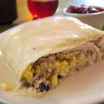The Gobblerito begins with a flour tortilla filled with a generous helping of housemade black bean mashed potatoes with butter and cream, salt and pepper, traditional stuffing of bread, celery, onion, sage and chicken stock, fresh corn and topped with 6 ounces of roasted turkey breast. The tortilla is folded into a square and steamed for five minutes. A big ladle of gravy made from flour, butter, turkey stock and seasonings is poured on top. A side portion of cranberry sauce completes the meal.