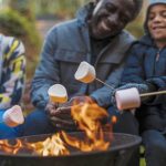 • Food: A fire serves double duty for roasting hot dogs and marshmallows. Serve hearty soup, stew or chili. Spices like chilies, cayenne, cinnamon, cumin and ginger help warm the body.