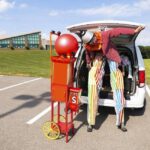 McGowan-Arrowroot reaches for a pair of metal stilts, which have shoes attached. He slips his feet in and wraps Velcro straps around each leg. He pulls the legs of his pants down over the stilts. He takes a drink of water from a bottle and methodically stands up, nearly bumping his head on the open door at the back of his van and grabs his red suitcase.