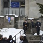 Police and officials are seen outside Pittsburgh Oliver Citywide Academy after a teen was shot twice while sitting in a school van outside of the Marshall-Shadeland building Wednesday, Jan. 19, 2022.