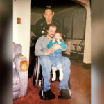 On the front porch of his home, two of his son’s wheelchairs rest folded up.