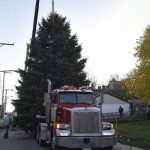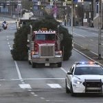 A truck carrying what will be this year’s Christmas tree moves along Centre Avenue on its way to the City-County Building in Downtown Pittsburgh on Saturday, Nov. 14, 2020.