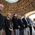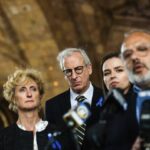 State Rep. Dan Frankel (center background) listens along with trial participants and congregation leaders as Jeff Finkelstein (right), CEO of the Jewish Federation of Greater Pittsburgh, speaks to local media after the guilty verdict was handed down against Robert Bowers on Friday in Pittsburgh.