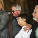 Alan Hausman, president of the Tree of Life congregation, puts his arm around longtime friend and co-president Barb Caplan, right, as they listen to remarks during a press conference after the guilty verdict in the Squirrel Hill synagogue shooting trial on Friday in Pittsburgh.