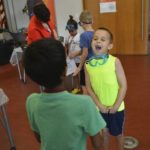 Isaiah Manzo, 7, takes a deep breath as he and others participate in an exercise to demonstrate how the circulatory system works during the Carnegie Science Center’s Science in the Summer program at Bridgeville Public Library on Tuesday, July 30, 2019. The program, which has visited several libraries this summer, offers students entering second through sixth grades the chance to take part in a four-day enrichment program to learn about digestion, the heart, brain and DNA.