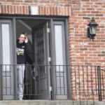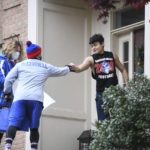 Chartiers Valley High School history teacher Scott Crimone fist bumps senior Jake Manalo as he, English teacher Pauline Beattie (left) and other faculty deliver caps, gowns and yard signs to all members of the Class of 2020 on Monday, May 11, 2020.