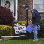 Chartiers Valley High School history teacher Scott Crimone gets items out of the trunk for a graduating senior as he and other high school teachers deliver caps, gowns and yard signs to all members of the Class of 2020 on Monday, May 11, 2020.