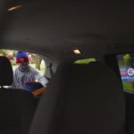 Chartiers Valley High School senior Aidan Krieg is seen through a van window as teachers Scott Crimone and Pauline Beattie deliver his cap, gown and yard sign Monday, May 11, 2020.