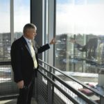 Principal Patrick Myers smiles as he looks down from a hallway two floors above, that’s encompassed by a railing and open to overlook the school.