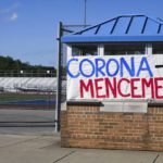 A sign that reads “Corona-mencement” hangs outside of the stadium at Chartiers Valley High School during a parade celebrating the Class of 2020 on Thursday, May 28, 2020.