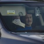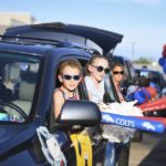 The feet of a graduating senior who was sitting through the vehicle’s sunroof are seen next to the driver’s head during a parade celebrating the Class of 2020 at Chartiers Valley High School on Thursday, May 28, 2020.