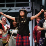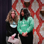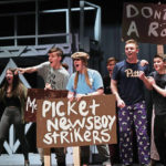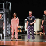 Freshman Brett Skerbetz as Les Jacobs (from left), senior Sreya Dey as Katherine Plummer, junior Joe Henry as Davey Jacobs and Maksim Shcherbatyuk as Jack Kelly perform during a rehearsal for South Fayette’s production of “Newsies” at the high school Tuesday, March 11, 2020.