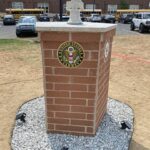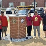 The five-sided brick monument honors district alumni who have served, or are currently serving, in the U.S. Armed Forces. A 24-pound stone eagle on a Liberty Bell rests atop the structure. Each side of the monument bears one of the five military branch emblems.