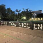In white letters on a black background, “Rest in Peace Charlie Kirk” was painted on the Forbes Avenue side, while “Say No to Political Violence” was messaged on the side facing CMU’s Hunt Library.