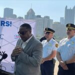 Mayor Ed Gainey, surrounded by several high-ranking police officers, previewed the public safety aspects of the holiday Thursday as he stood near Pittsburgh’s three-river confluence.