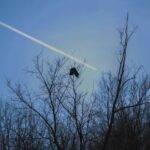 A piece of debris is seen on a tree at the site of a fatal house explosion in the Township of Crescent on Tuesday.