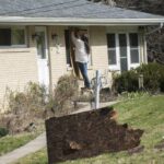 A neighbor tries to repair her damaged window at the site of a fatal house explosion on Tuesday.