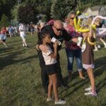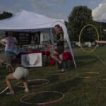 Bailey Zembower, 32, center, from “Art in Motion Pittsburgh” gives children some pointers in the use of hoops during Aspinwall’s “Big Night Out” community festival on Aug. 10, presented at the borough’s recreation fields by Aspinwall Neighbors, a civic group.