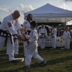Mike Dufault, left, 4th degree taekwondo master performs with his students during Aspinwall’s “Big Night Out” community festival on Aug. 10.