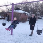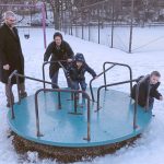 The children used the swings, merry-go-round and other playground equipment as they all made their way through the snow in the recreation site.