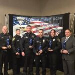 Six officers were presented with the “Not on My Watch” award Nov. 1 at the 24th annual Amen Corner Senator John Heinz Law Enforcement Awards Luncheon for their bravery during the March 19 workplace shooting in Blawnox. They are (from left) O’Hara police Officers Craig Cress and Maria Sciacca, Millvale police Officers Timothy McDonough and Evan Egerter, Aspinwall police Officer Leann Heffley and Blawnox police Officer Aaron Zola.