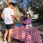 Adam Haines, 16, of Aspinwall stops by a lemonade stand on an unseasonably warm Nov. 1. CeCe Marlier (left), 9, and her friend, Greta, 10, were selling cups of lemonade and leftover Halloween candy.