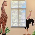A brightly colored jungle-themed mural has transformed the walls with paintings of an elephant spraying water onto an umbrella-wielding monkey, sleepy lions resting on cupboards and ostriches batting long eyelashes at guests.