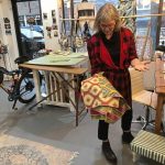 Mossy Lane Products owner Elaine “Lane” Root examines fabric at her Aspinwall clothing boutique. The Indiana Township seamstress will have one of her creations featured in the upcoming Ecolution Fashion Gala on April 13 at the Carnegie Museum Hall of Architecture.