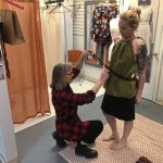 Elaine “Lane” Root, owner of Mossy Lane Clothing Boutique in Aspinwall, checks the belt on model Suzan Falvey of Point Breeze. Falvey is to model one of Root’s creations in a fashion show April 13 at the Carnegie Museum Hall of Architecture, 4400 Forbes Ave., presented by Pittsburgh Earth Day.