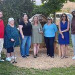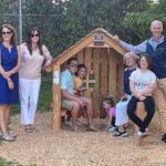 District Association members (from left) Adrienne Laing, Heather Golden, Matthew Rudzki and daughters Lydia, 4, and Lorelei, 2, Paula Hiteshew and her grandaughter, Joy Lawrenson, and Eric Sauereisen pose for a picture during a dedication ceremony Aug. 22 for a new playhouse at Sharpsburg’s 16th Street Park.