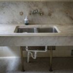 The Smiths have collected items that the house has “given” them and keeps them on display in a separate room with a few items displayed just outside the kitchen, which features original Delft tile and an oversized marble double sink.