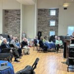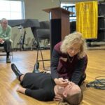 Eliza Davis, a senior at Fox Area Chapel High School, pretends to be unconscious from a drug overdose as Dr. Janet Astle shows how to dispense medication from a bottle of Narcan, also known as naloxone, an over-the-counter drug used to treat a known or possible opioid overdose. The demonstration took place Jan. 24 during a meeting of the Fox Chapel Rotary at the Lauri Ann West Community Center in O’Hara.