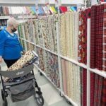 Jackie Stebler pushes her walker among the rows of fabric. She’s in search of the perfect material.